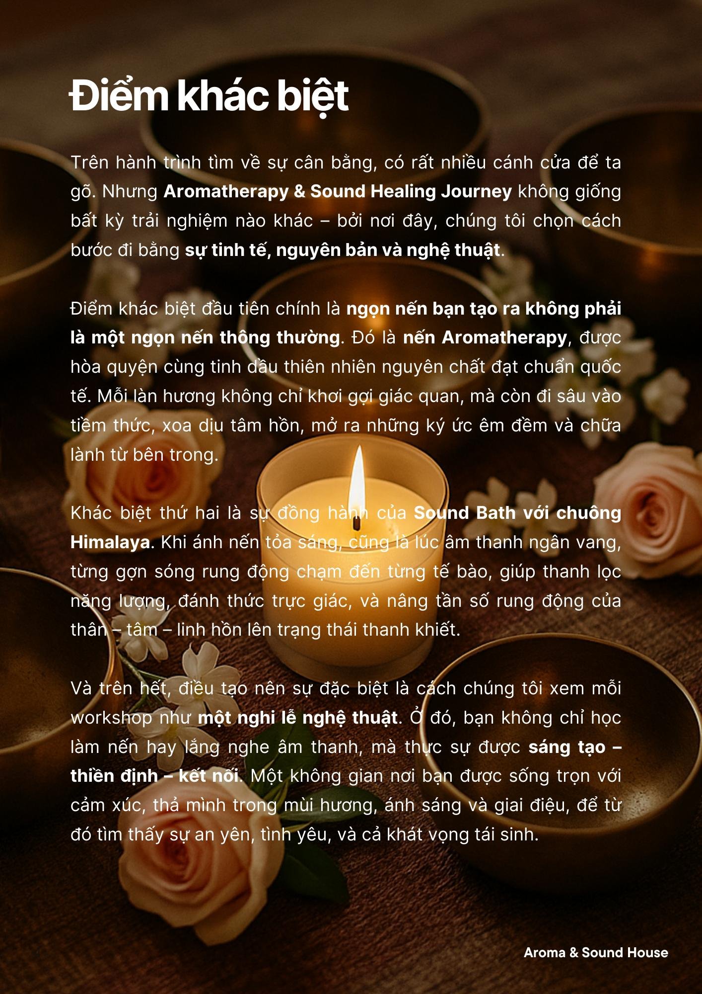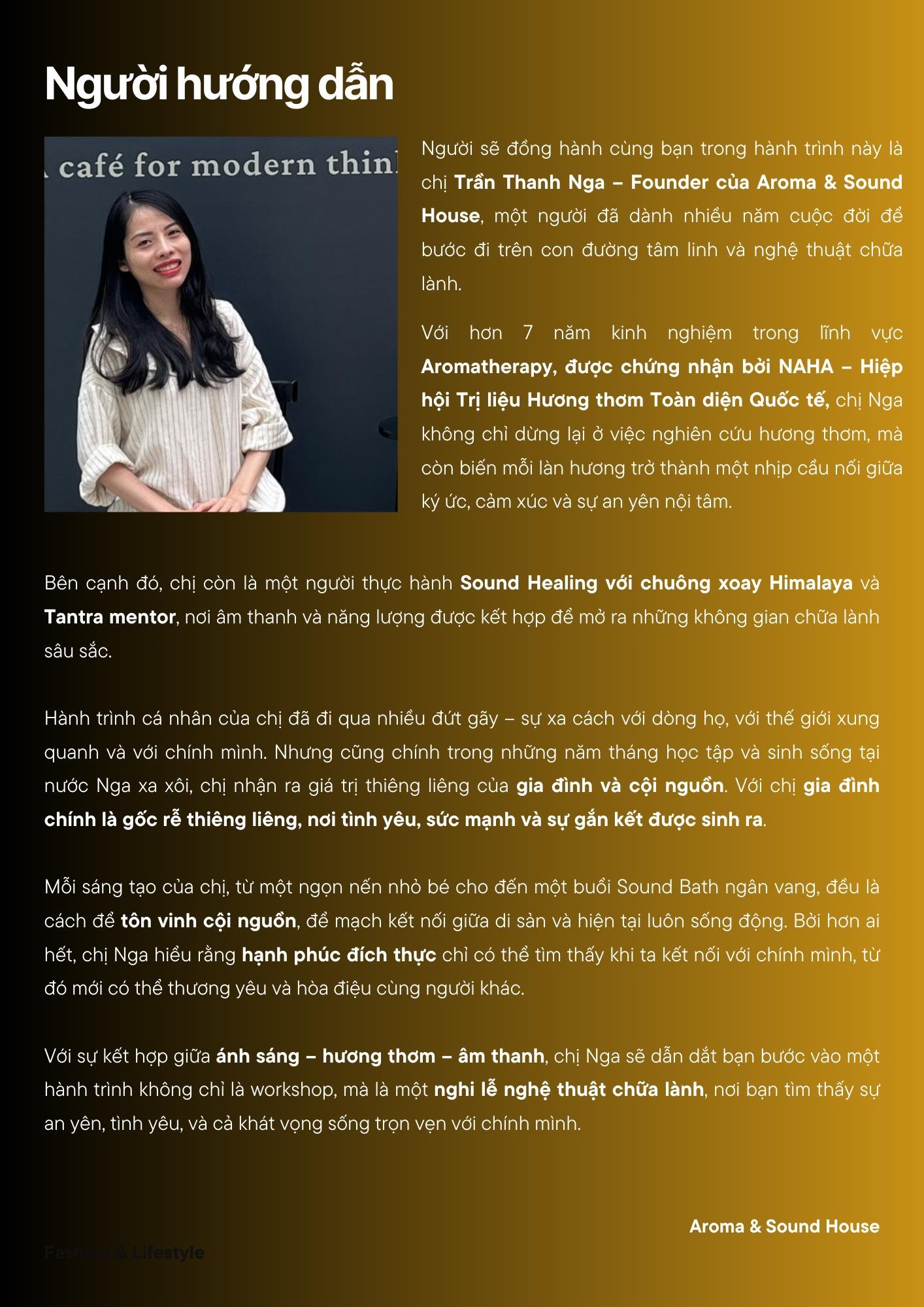 Người đồng hành cùng bạn trong hành trình này là Founder của Aroma and Sound House – chị Trần Thanh Nga – một Aromatherapist với hơn 7 năm kinh nghiệm, sở hữu chứng chỉ quốc tế của NAHA (National Association for Holistic Aromatherapy) và là người thực hành Sound Healing bằng chuông xoay Himalaya. Sự kết hợp giữa kiến thức chuyên sâu và trải nghiệm nghệ thuật sẽ dẫn dắt bạn đi qua từng cung bậc của ánh sáng và thanh âm.